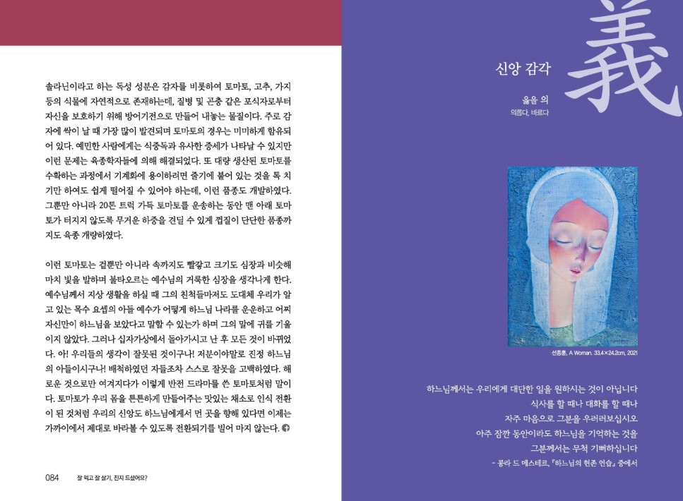 이런 토마토는 겉뿐만 아니라 속까지도 빨갛고 크기도 심장과 비슷해 마치 빛을 발하며 불타오르는 예수님의 거룩한 심장을 생각나게 한다. 예수님께서 지상 생활을 하실 때 그의 친척들마저도 도대체 우리가 알 고 있는 목수 요셉의 아들 예수가 어떻게 하느님 나라를 운운하고 어찌 자신만이 하느님을 보았다고 말할 수 있는가 하며 그의 말에 귀를 기울 이지 않았다. 그러나 십자가상에서 돌아가시고 난 후 모든 것이 바뀌었 다. 아! 우리들의 생각이 잘못된 것이구나! 저분이야말로 진정 하느님 의 아들이시구나! 배척하였던 자들조차 스스로 잘못을 고백하였다. 해 로운 것으로만 여겨지다가 이렇게 반전 드라마를 쓴 토마토처럼 말이 다. 토마토가 우리 몸을 튼튼하게 만들어주는 맛있는 채소로 인식 전환 이 된 것처럼 우리의 신앙도 하느님에게서 먼 곳을 향해 있다면 이제는 가까이에서 제대로 바라볼 수 있도록 전환되기를 빌어 마지 않는다.