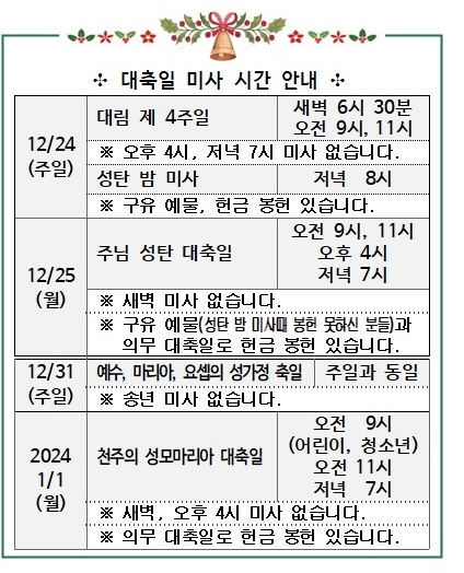 2023.12 24/25/31/01 성탄 새해 전례 안내 - 첨부파일 : 750ee552_bcbac5babbf5c7d8_c0fcb7cabec8b3bb.jpg (145byte) - 다운로드 464 이전글 다음글 목록 본문