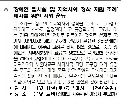 2023.11 11/12 장애인 탈시설 및 지역사회 정착 지원 조례 폐지를 위한 서명 운동 - 첨부파일 : 715370d5_282023111129_c0e5bed6c0cebdc3bcb3.jpg (76byte) - 다운로드 480 이전글 다음글 목록 본문