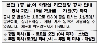 2023.10 02/10 본관 1층 남,여 화장실 리모델링 공사 안내 - 첨부파일 : 9d9aa5bf_c7cfb0e8_230924001_28c8adc0e5bdc7_b8aeb8f0b5a8b8b529.jpg (70byte) - 다운로드 484 이전글 다음글 목록 본문