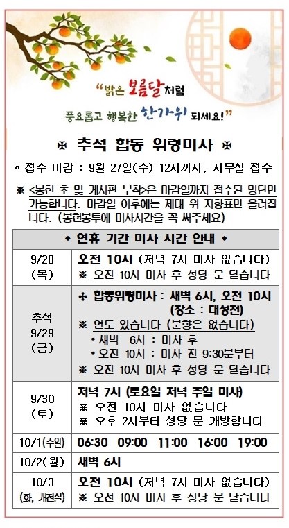 2023.09 28/10 추석연휴 전례 안내 - 첨부파일 : 76c0f5a1_c7cfb0e8_23092400128c3dfbcaec7d5b5bfc0a7b7c9b9ccbbe729.jpg (150byte) - 다운로드 466 이전글 다음글 목록 본문