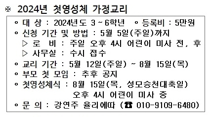2024.05 12/08 첫영성체 가정교리 안내 - 첨부파일 : 8d9a678d_c3b9bfb5bcbac3bc_b0a1c1a4b1b3b8ae.jpg (76byte) - 다운로드 337 이전글 다음글 목록 본문
