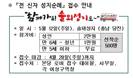 2024.03 24 전신자 성지순례 접수안내 - 첨부파일 : 9ec74bde_c0fcbdc5c0da_bcbac1f6bcf8b7ca_c1a2bcf6bec8b3bb.jpg (101byte) - 다운로드 350 이전글 다음글 목록 본문