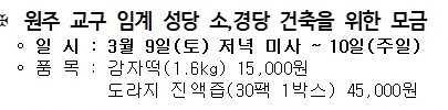 2024.03 09/10 원주교구 임계성당 소경당 건립 물품판매 - 첨부파일 : f8f05435_bff8c1d6b1b3b1b8_c0d3b0e8bcbab4e7_b9b0c7b0c6c7b8c5.jpg (34byte) - 다운로드 440 이전글 다음글 목록 본문