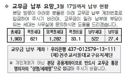 2024.03 17 교무금 납부현황(2024년 3월 17일) - 첨부파일 : 452ce101_b1b3b9abb1ddb3b3bacec7f6c8b2.jpg (141byte) - 다운로드 446 이전글 다음글 목록 본문