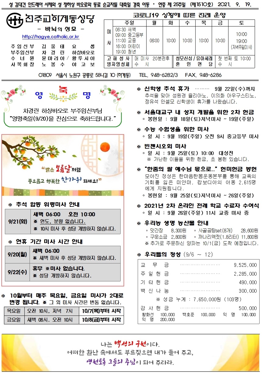 제1510호(2021. 09. 19.) 하계동성당주보 : 성 김대건 안드레아 사제와 성 정하상 바오로와 동료 순교자들 대축일 …