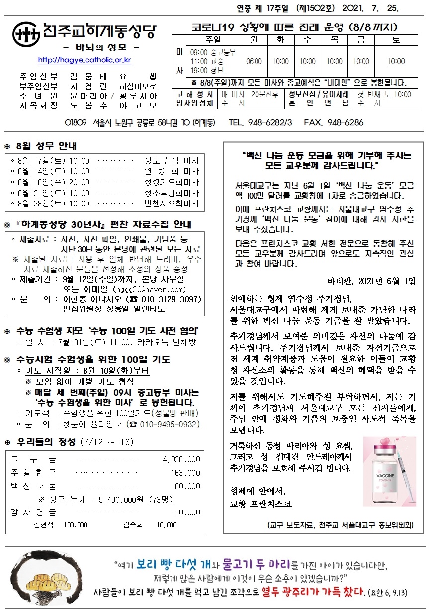 제1502호(2021. 07. 25.) 하계동성당주보 : 연중 제 17주일