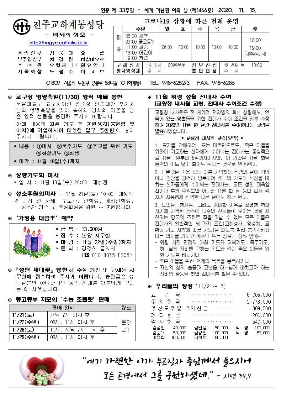 제1466호(2020. 11.15) 하계동성당주보 : 연중 제 33주일 / 세계 가난한 이의 날