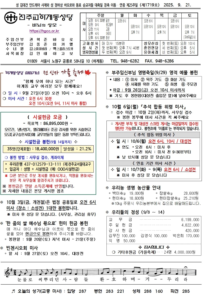 제1719호(2025. 9. 21.) 성 김대건 안드레아 사제와 성 정하상 바오로와 동료 순교자들 대축일 경축이동 · 연중 제…