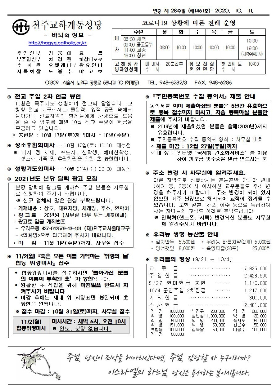 제1461호(2020. 10.11) 하계동성당주보 : 연중 제 28주일