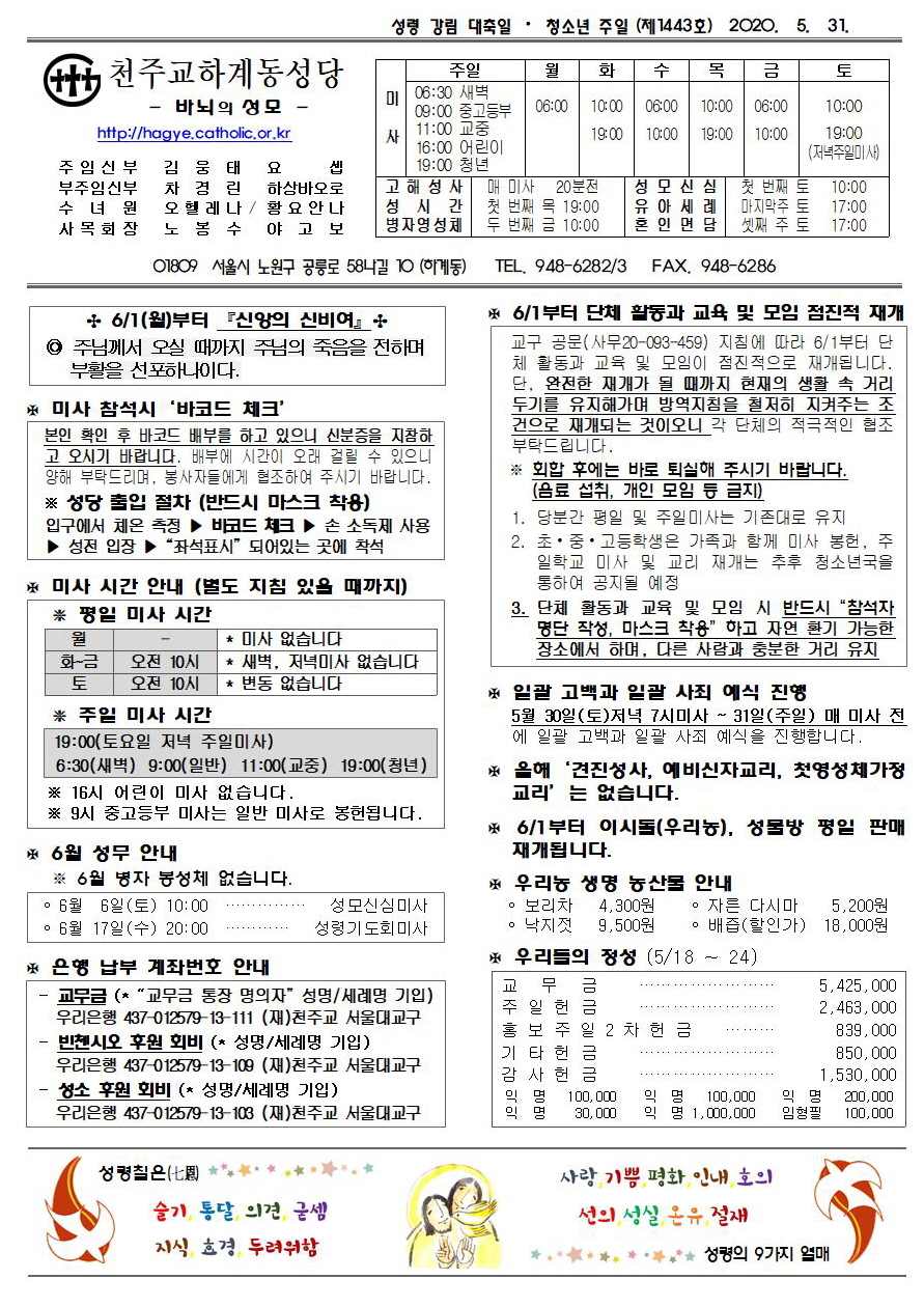 제1443호(2020. 05.31) 하계동성당주보 : 성령 강림 대축일 / 청소년 주일