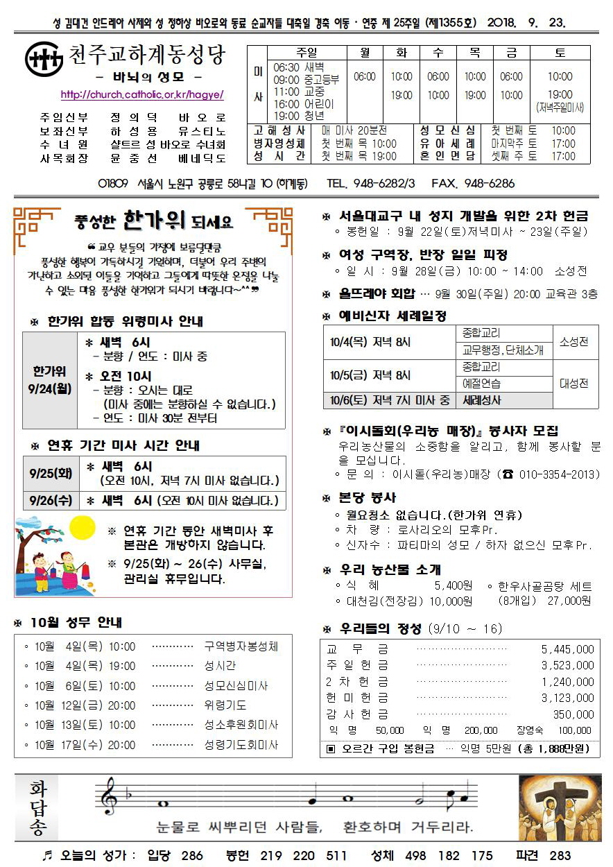 제1355호(2018. 9.23.) 하계동성당주보 : 성 김대건 안드레아 사제와 성 정하상 바오로와 동료 순교자들 대축일 경축…